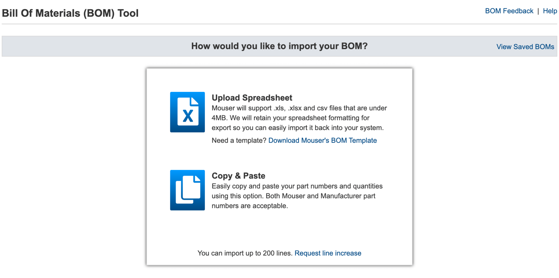 La herramienta BOM de Mouser le permite importar sus datos de dos maneras: