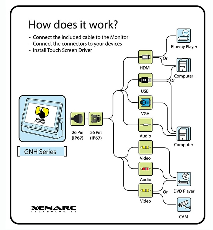 Xenarc Technologies 1029 Series 10.1" IP65 Water Resistant Monitors are direct sunlight readable, IP65 dust/splash-proof, and feature capacitive touchscreens with built-in waterproof speakers. The 1,000 NIT rated brightness of the water and dust resistant 1029 Series makes it ideal for challenging outdoor applications under direct sunlight and protects from environmental hazards.The Xenarc 1029 Series capacitive touchscreen panel provides a more responsive touch interface than resistive touch. The rugged, heavy-duty 10.1" industrial monitor is available with optical bonding and an IP67 rating as the 1029GNH.